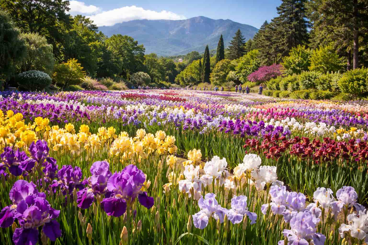 Следом за парадом тюльпанов в мае стартует карнавал ирисов — более 300 сортов этих прекрасных цветов, создающих настоящую радугу на клумбах.